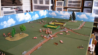 Here then is the cropped and cleaned up photo. Still a bit of background above the clouds upper left but not so much that it detracts from what is going on the table, or so I hope. We can clearly see the officer group in the center, and some sort of activity to the left, upper middle, and perhaps upper right. Casualties are evident in the foreground right, and lower right.